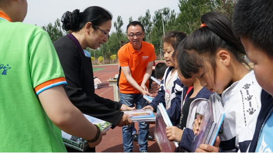 刘巨澜副处长(左一)和张洪钢副经理(中)向孩子们赠书