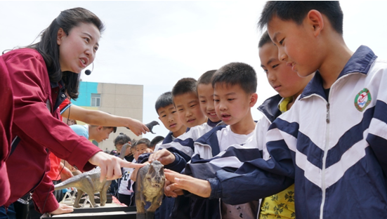 仪式结束后,800多名师生在操场观看了恐龙、古鸟、植物、昆虫以及恐龙模型等20多件珍贵化石标本,党员同志们为孩子们做了详细的讲解和展示,烈日炎炎之下虽然辛苦,但面对孩子们惊讶的表情,渴望知识的眼神,同志们却倍感欣慰并深受感动。