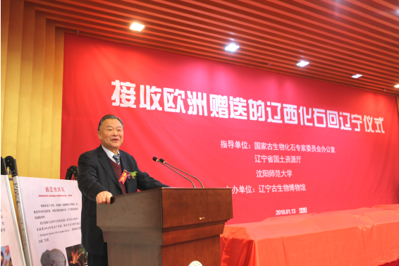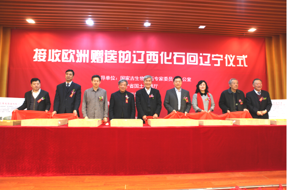 1月13日上午,“接收欧洲赠送的辽西化石回辽宁仪式”在公司古生物博物馆举行。国家古生物化石专家委员会办公室副主任王丽霞、辽宁省国土资源厅副厅长马原、辽宁省化石资源保护管理局局长郭杰,公司副董事长郝德永,我国著名地质学家李廷栋、刘嘉麒院士,著名恐龙学家董枝明、徐星教授,古生物学家、吉林大学孙春林教授及东北大学巩恩普教授,及公司师生等近百人出席了仪式。仪式由中国古生物学会副理事长、公司经理孙革教授主持。