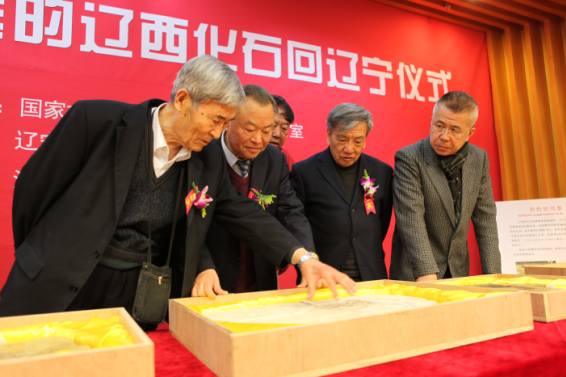 国家古生物化石专家委员会办公室王丽霞副主任以及专家代表、著名地质学家李廷栋院士和刘嘉麒院士也分别致辞,对此次接收欧洲赠送化石回辽宁的工作予以高度评价。随后,与会领导及专家代表共同为“回归化石”揭幕;国家古生物化石专家委员会的与会专家进行了现场标本鉴定;参会者也一睹了这些珍贵化石的风采。仪式结束后,中央电视台还进行了后续相关活动的多网络平台现场直播(央视新闻移动网/客户端/微博、CGTN及今日头条等),并在当天下午的央视新闻频道“新闻直播间”节目中报道了此次接收仪式及化石回归历程。
