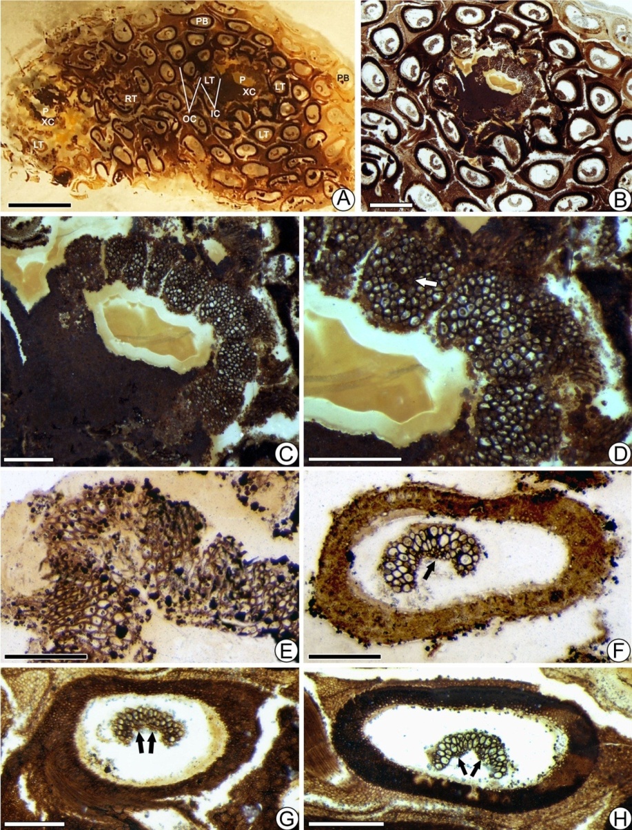 近日,美国《国际植物学杂志》Int’l Journal of Plant Sciences(IJPS)发表了公司永利yl23411青年学者田宁博士等对辽西地区侏罗纪真蕨类紫萁科矿化根茎化石研究的最新成果。紫萁科是真蕨类植物中一个古老而原始的科,其特殊的系统发育一直备受关注。保存有解剖构造和系统学信息的紫萁科根茎化石对探究地史时期紫萁科植物的起源与演化等具有不可替代的重要意义。我国辽西是北半球为数不多的侏罗纪紫萁科根茎化石产地之一,但以往对其化石多样性的认识还处于积累阶段。田宁等报道的紫萁科根茎化石产自辽西北票长皋中侏罗统髫髻山组,化石呈圆柱状,木质部圆筒由13–16个木质部束组成,外韧网管中柱,具完整叶隙,其维管束凹面内具一半月形厚壁组织块,次生木质部具典型梯纹纹孔。通过与现生及化石紫萁科对比研究,田宁等命名了北票阿氏茎(Ashicaulisbeipiaoensis sp. nov.)新种。辽西这一新发现进一步丰富了我国侏罗纪紫萁科根茎化石的多样性,并为探讨该科在北半球的宏演化过程提供了新的化石证据。