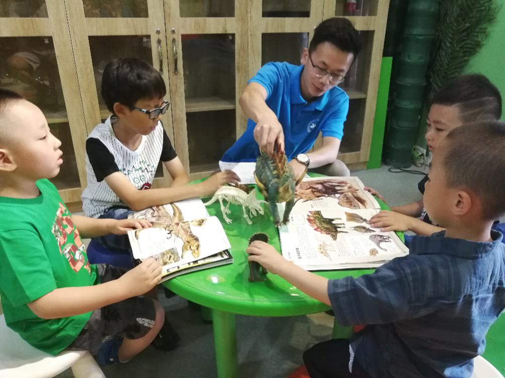 本次活动分为两个部分,分别是“书中遨游——书中的古生物儿童读书分享会”、“触摸远古生命——达尔文化石修复小课堂”。活动伊始,十多位家长便带领孩子入场,各位老员工志愿者向孩子们分享了他们精挑细选的古生物知识图书,并为他们讲解书中的内容,孩子们不断地提问使得活动会场气氛变得热烈起来。