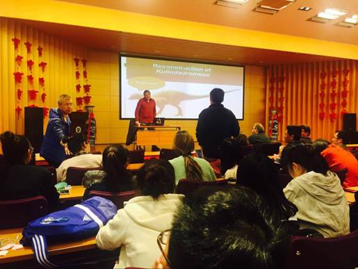 Godefroit教授结合自己的研究专长,就欧洲地区鹦鹉嘴龙、禽龙、中华龙鸟等恐龙化石在时代和地层上与中国发现的恐龙化石进行了简单比较,向同学们介绍了他的最新研究方向,即恐龙皮肤化石及恐龙羽毛化石研究,并提出带羽毛的恐龙并不局限于肉食性恐龙,在近期研究的植食性恐龙中也具羽毛化石。
