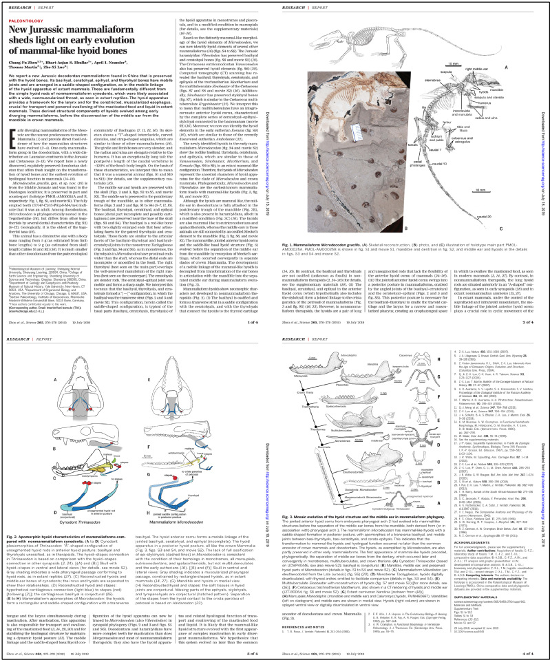 7月19日,美国《科学》(Science)杂志发表了公司国际合作课题组的最新论文《新的侏罗纪哺乳型动物揭示了哺乳动物舌骨的早期演化》。这一新成果是由公司自然资源部东北亚古生物演化重点实验室周长付教授与国际著名古哺乳动物学家、美国芝加哥大学罗哲西教授、德国波恩大学T.马丁教授和美国耶鲁大学A.布拉尔博士等合作完成。该化石被命名为“微小柱齿兽” (Microdocodon),是我国及全球首次发现的舌骨保存最完整的侏罗纪哺乳型动物,产于内蒙古宁城五化地区距今约1.64亿年的侏罗纪地层。