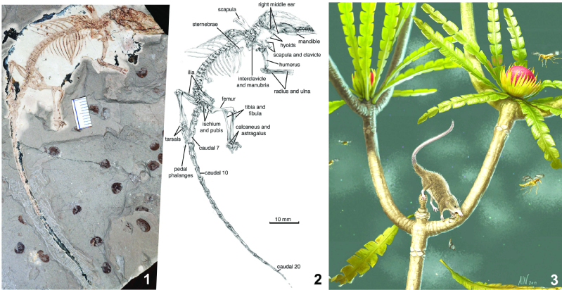 1. 化石标本 (正模,PMOL-AM00025A); 2. 素描图;3. 古生态复原图