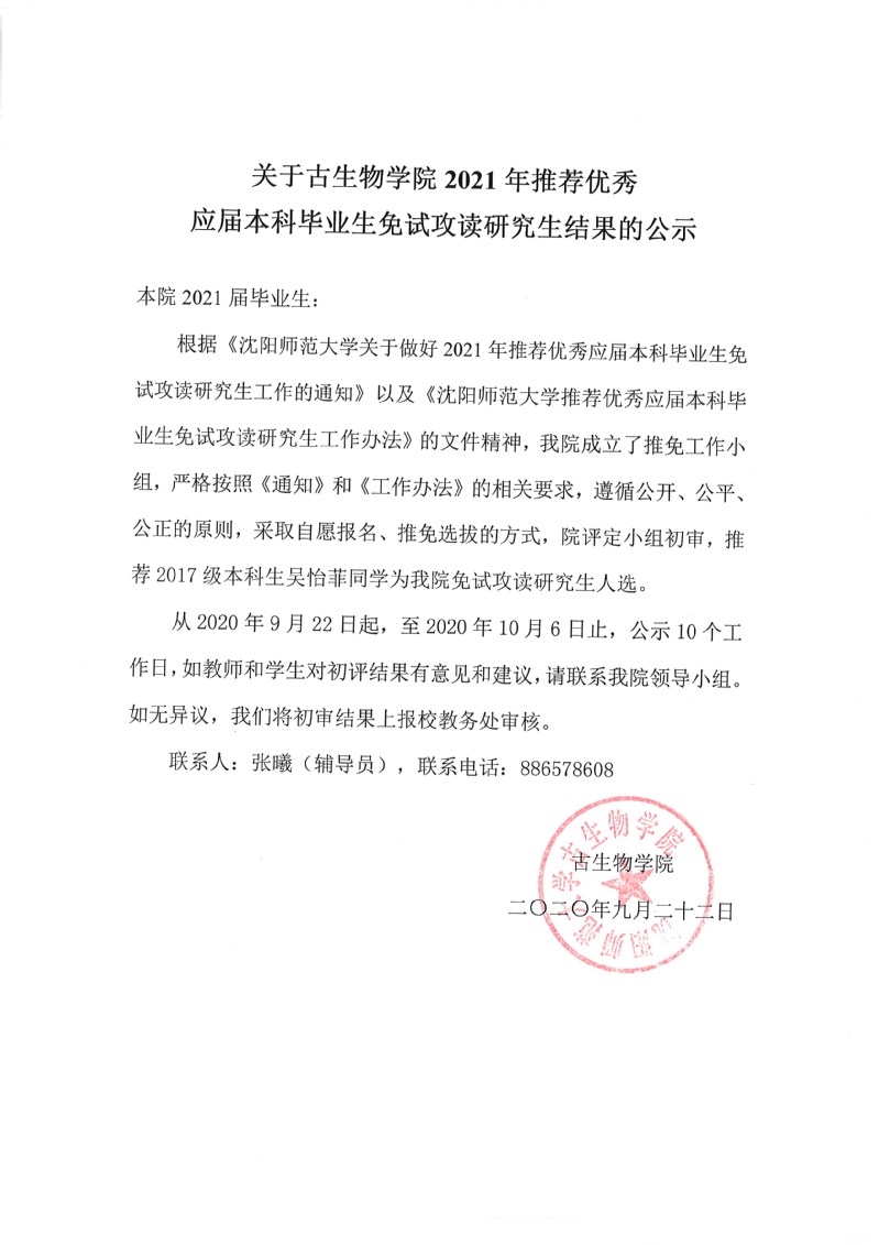 关于永利yl234112021年推荐优秀应届本科毕业生免试攻读研究生结果的公示