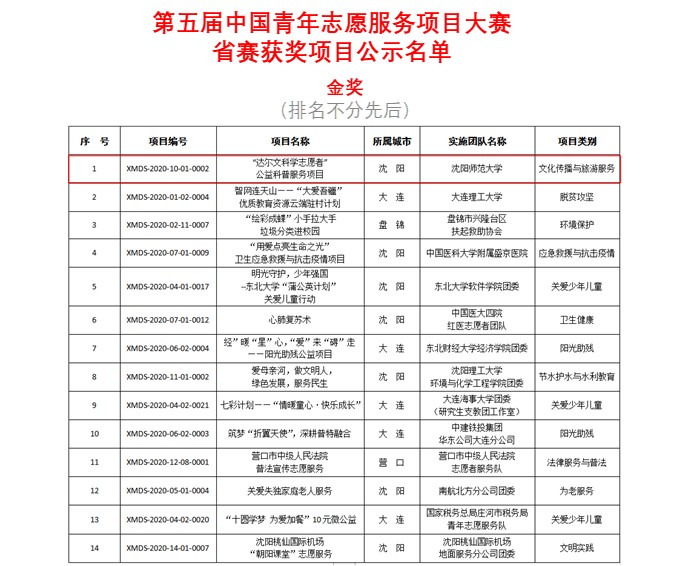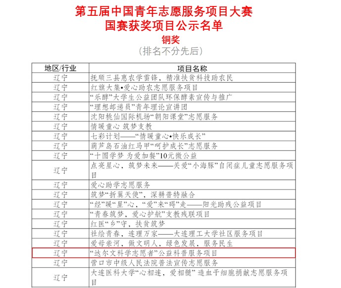 近日,团中央组织开展了主题为“志愿新时代,共筑中国梦”——第五届中国青年志愿服务项目大赛,团省委对省内各高校、社会机构推送作品进行了认真评审,公司“达尔文科学志愿者”公益科普服务项目作为永利yl23411团委选派项目成功入围,喜获辽宁省金奖。并被推荐参加国赛,经过积极努力,最终获得国家级铜奖。