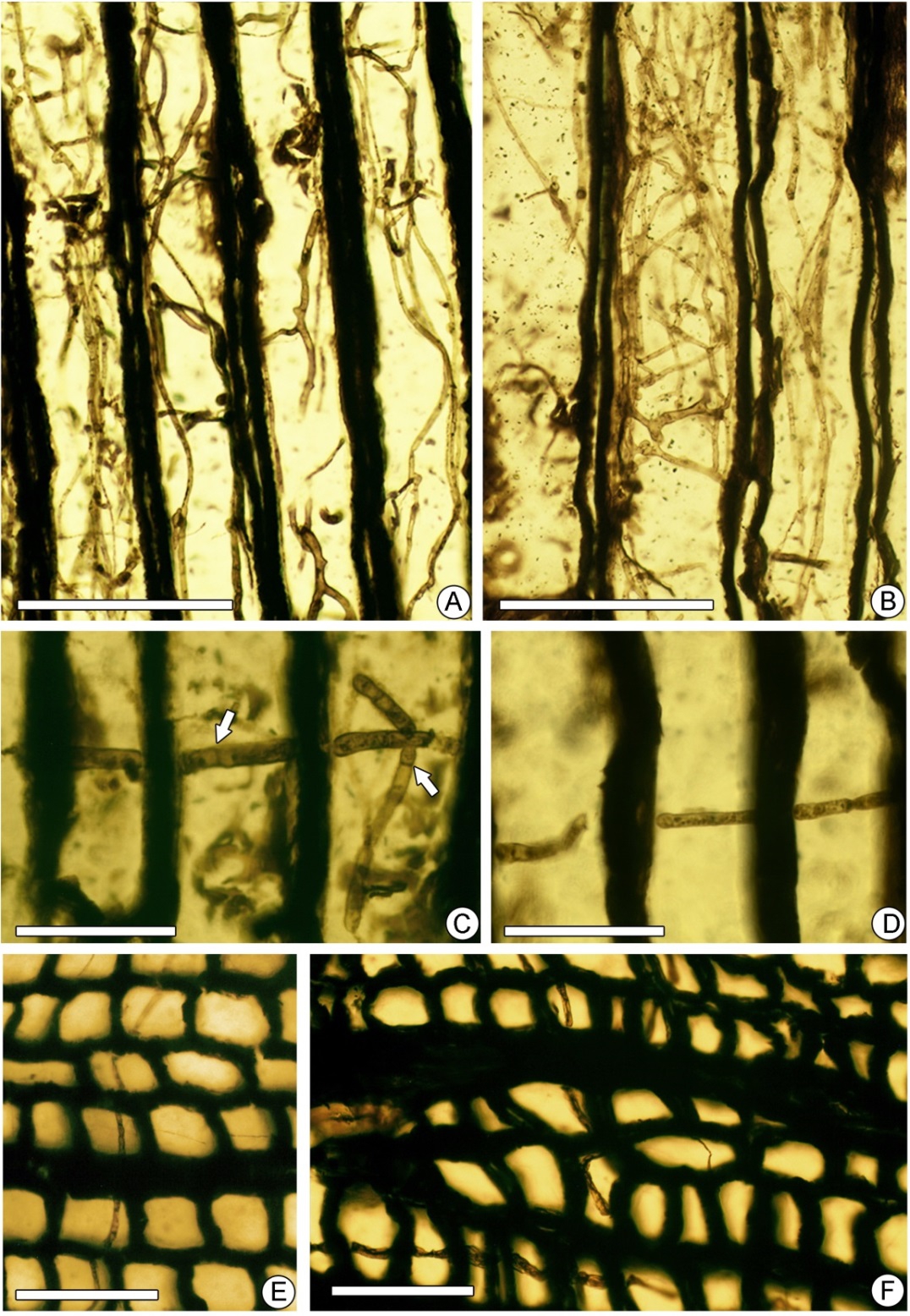 进一步的研究显示,黑龙江白垩纪含真菌菌丝木化石木材组织中横切面及径切面均可以观察到非常典型的中间层缺失的现象,与现代典型的白色腐朽菌十分类似。因此,从木化石木材腐朽特征推断当前真菌菌丝化石在功能上属于白腐菌。除此之外,该研究团队还在浙江新昌下白垩统馆头组的松柏类木化石“贝壳杉型木”(Agathoxylon sp.)中也发现了类似的具有白腐功能的担子菌菌丝化石。