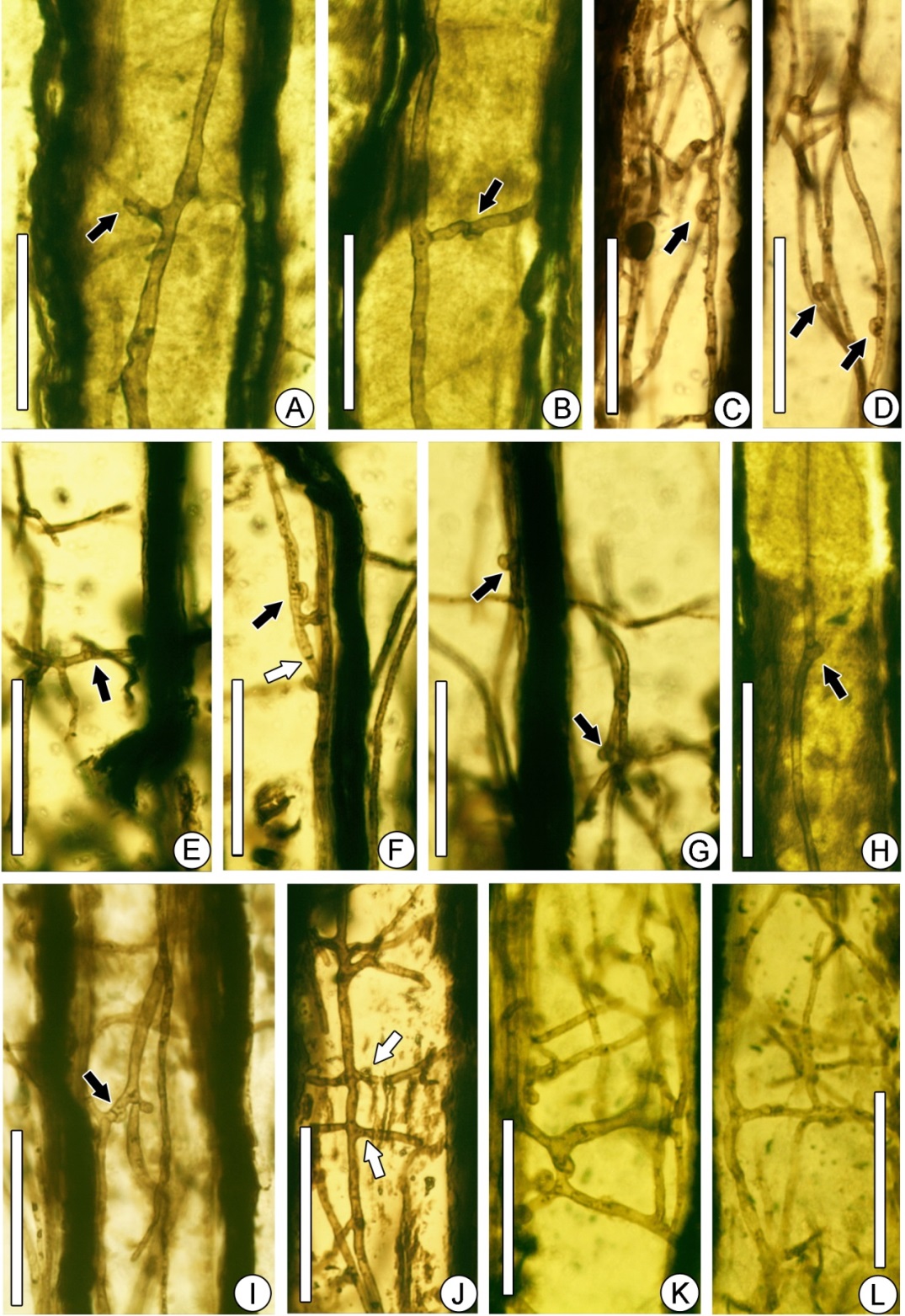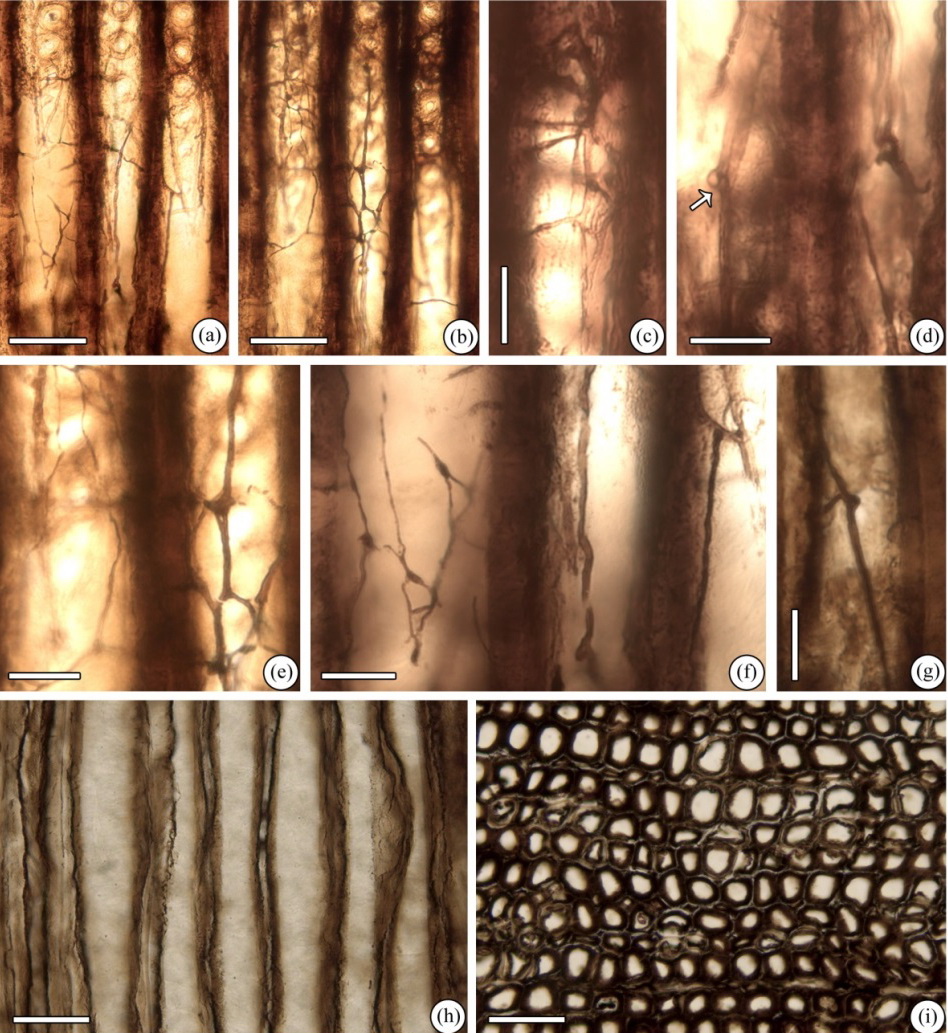 研究团队在黑龙江下白垩统云山组的松柏类木化石 “宝密桥柏型木”(Cupressinoxylon baomiqiaoense Zheng et Zhang)中发现了保存精美的化石菌丝,以复杂的网格状菌丝体形式保存在木材次生木质部中。菌丝多见于管胞腔内,可以直接通过径壁纹孔口或者直接穿透管胞壁在相邻管胞间扩散。菌丝呈管状,多平直或弯曲,常以不同角度作不规则分枝,表现出典型的锁状联合(clamp-connection),显示了现代担子菌类所特有的特征,表明这一菌丝化石属于担子菌类(Basidiomycetes)。