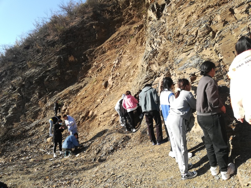 经过短暂的休整后师生再出发,前往本次爱专业教育最重要的一站碱厂组化石采集点——亲手打化石。冯老师介绍本次采集的目标化石为三叶虫化石,并详细讲解三叶虫类化石标本的形成过程及埋藏条件,并趣谈其名字的由来拿着地质锤的同学们早已迫不及待,经过一个多小时的工作同学们打到了多块珍贵的化石标本