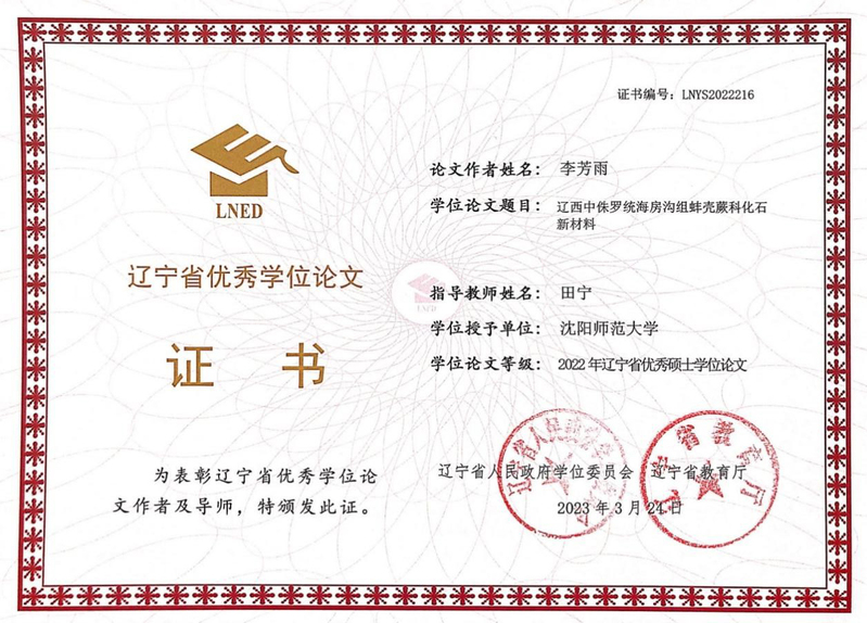 近日,在辽宁省人民政府学位委员会、辽宁省教育厅组织的2022年辽宁省优秀硕士学位论文评选中,由公司田宁教授指导、李芳雨同学撰写的硕士学位论文《辽西中侏罗统海房沟组蚌壳蕨科化石新材料》,获评“辽宁省优秀硕士学位论文”。这是公司深入推进研究生教育综合改革、着力提升公司产品质量所取得的重要成果。
