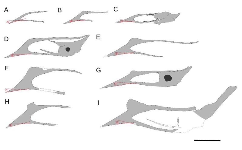 A, 董氏中国翼龙(BMNHC-Ph000074); B, 返祖中国翼龙(XHPM 1009); C, 董氏中国翼龙(JPM-2014-005); D, 董氏中国翼龙(IVPP V 13363); E, 李氏始无齿翼龙(BMNHC-PH000075); F, 董氏中国翼龙(GMN-03-11-001); G, 义县始无齿翼龙(IVPP V 14190); H, 具冠中国翼龙(ZMNHM 8131); I, 本溪中国翼龙(BXGM V0011)(张鑫俊供图)