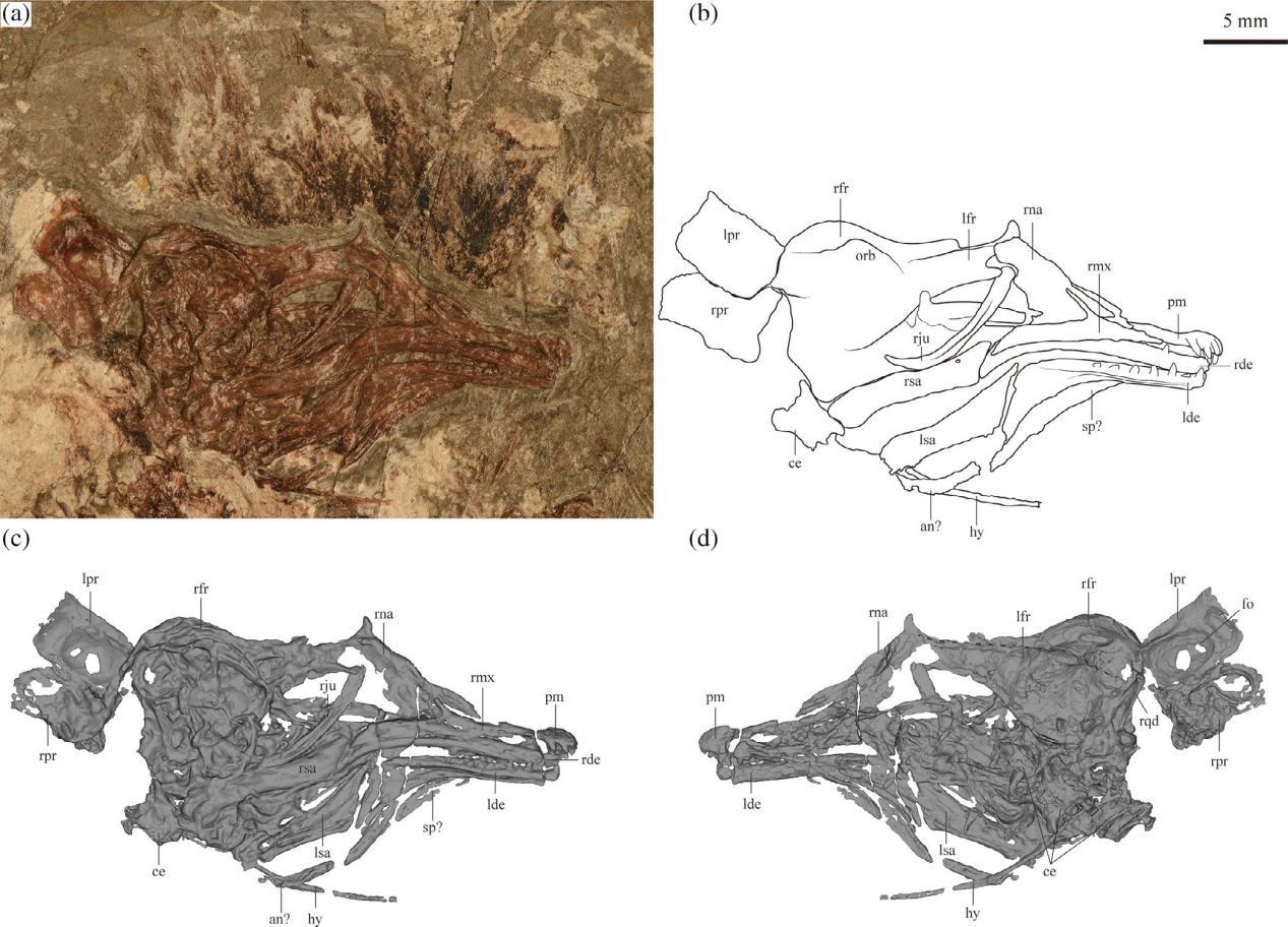 大平房鸟头骨照片、线条图和三维重建