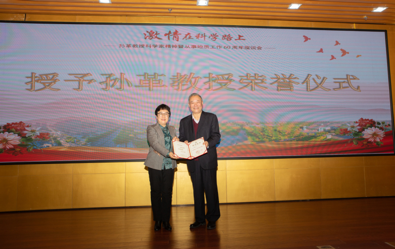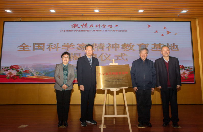 会议最后,杨松董事长代表学校授予孙革教授“终身荣誉教授”称号;学校领导和与会嘉宾还为我院古生物博物馆“全国科学家精神教育基地”“孙革教授从事地质工作60周年事迹展”“孙革教授荣誉工作室”举行了揭牌仪式。