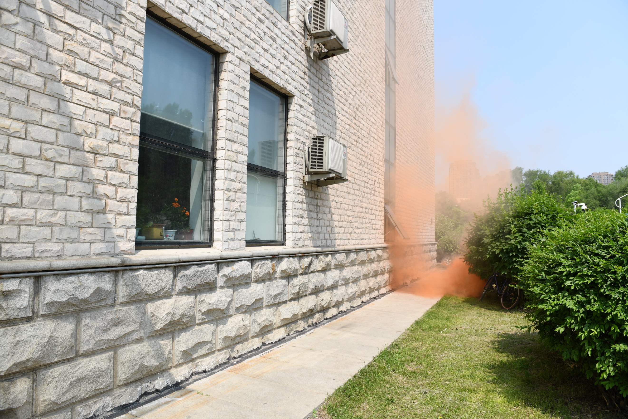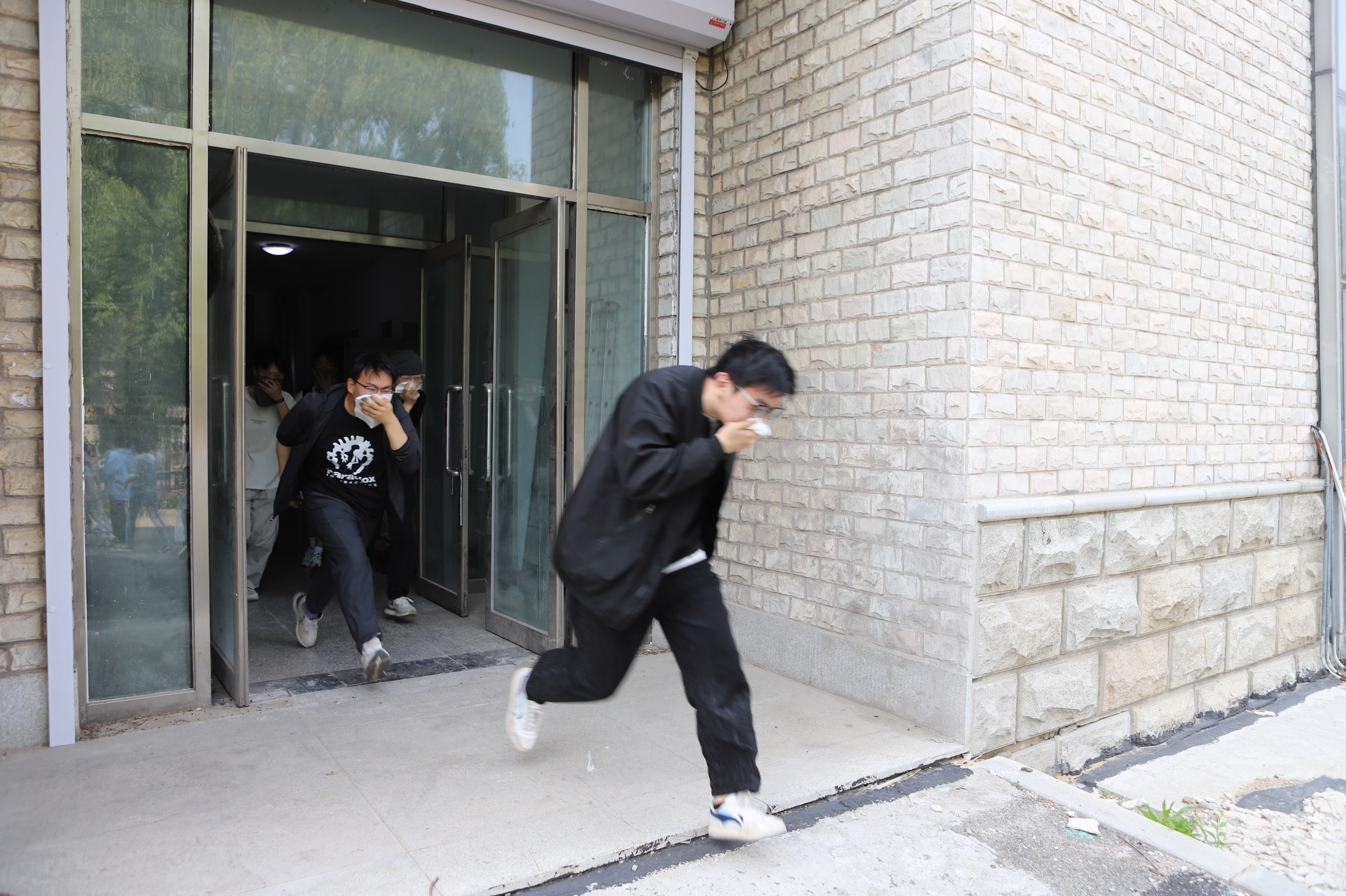 理论培训结束后,全员转入实战演练阶段。随着孟书记发出演习开始的号令,工作人员立即使用烟雾弹,馆内楼道顿时升起了滚滚浓烟,消防警报声骤然响起,博物馆立即启动应急预案:各楼层安全员迅速就位,引导师生用湿毛巾捂住口鼻,沿安全通道弯腰低姿撤离;安保团队同步关闭防火卷帘、切断非消防电源,并模拟向119指挥中心报警,同时公司师生也同步进行疏散逃生。仅用时2分45秒,全体人员便安全集结至指定疏散区域,整个过程紧张而不慌乱,充分检验了院馆突发安全事件应急预案的可行性。