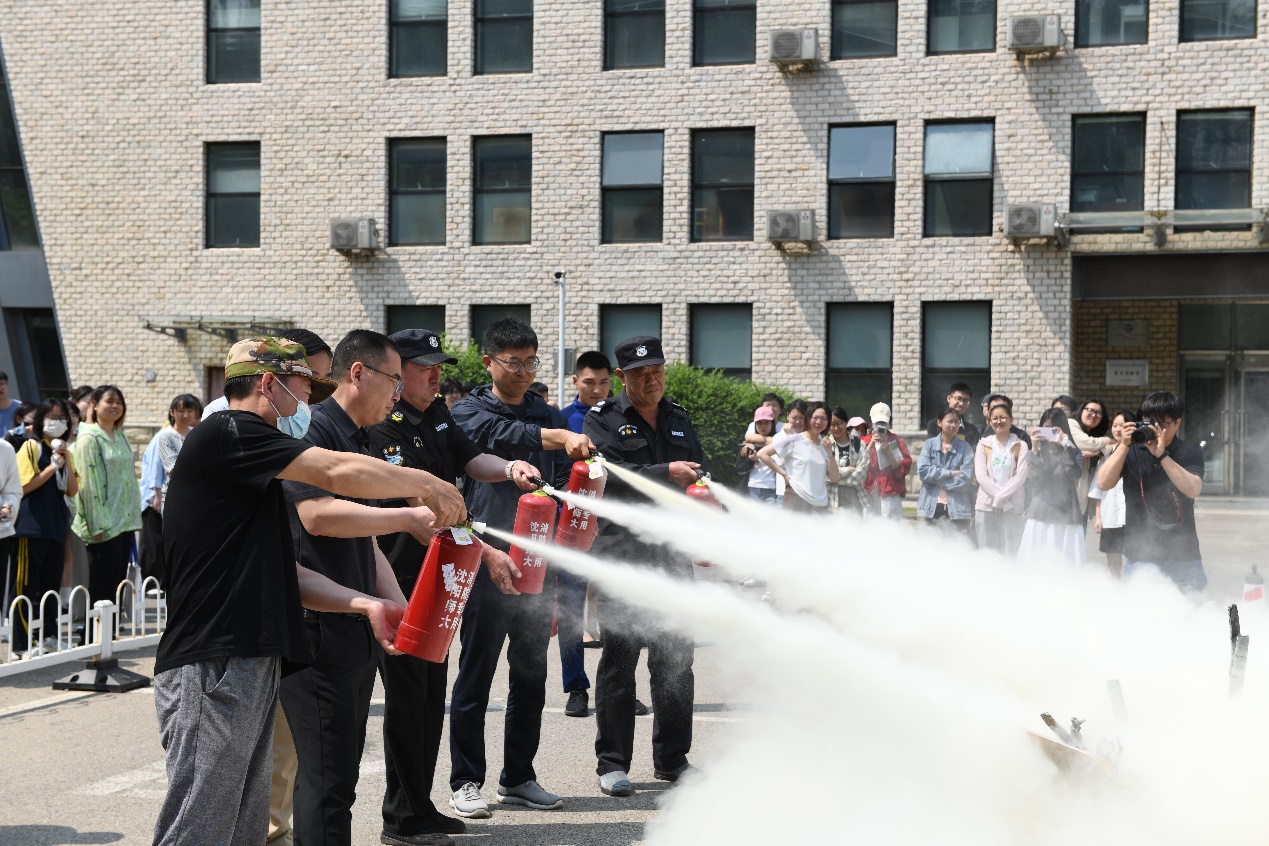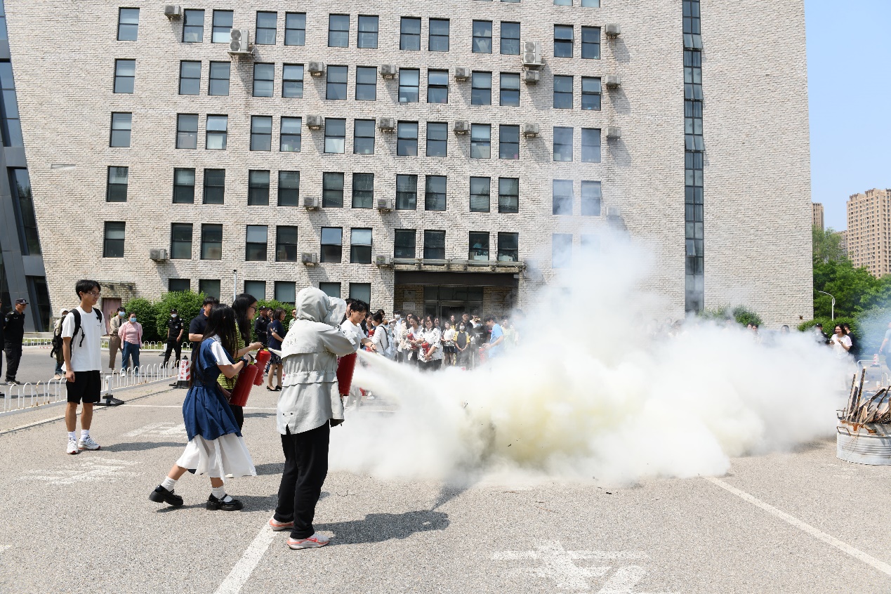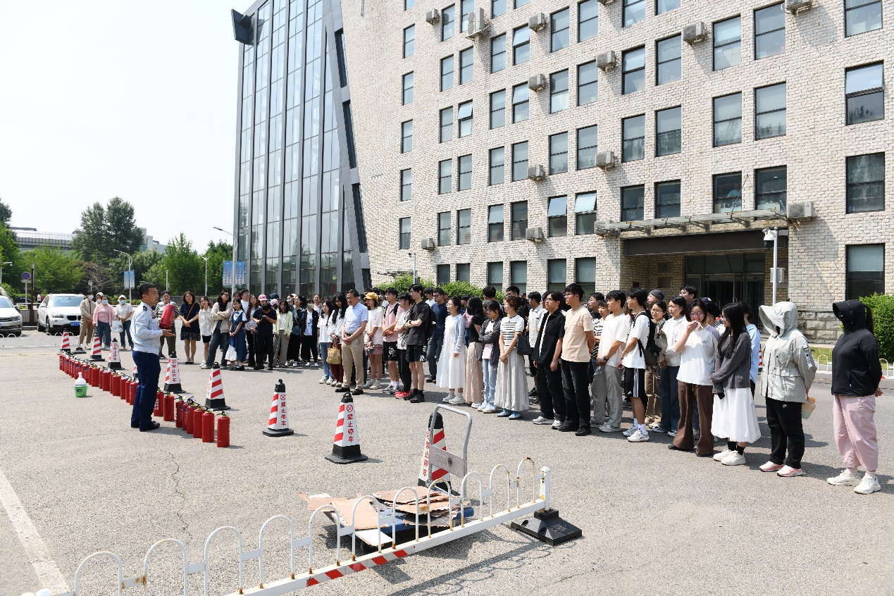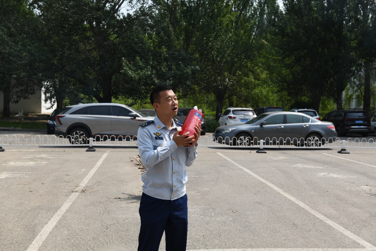 在博物馆东门停车场的灭火演练环节,张岩指导员在设置的油桶灭火场景现场演示了干粉灭火器四步操作精髓,并着重讲解了对准火焰根部、保持安全距离等要点。“一提、二拔、三瞄、四压”,随着简明口令的响起,院馆师生、工作人员及安保队伍分批上前,直面火源,勇敢操作灭火器进行扑救演练,对准火焰根部果断喷射,白色干粉瞬间覆盖火源,现场响起阵阵掌声。