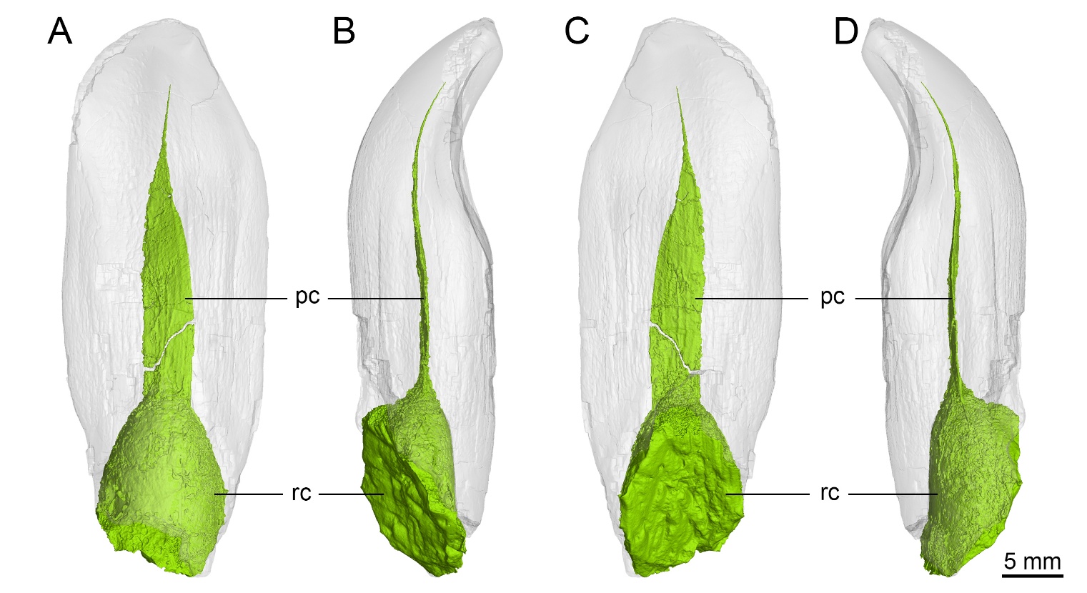 图2马门溪龙类牙齿(PMOL-ADt0009)牙髓腔的CT渲染图,A.舌侧视;B.近中视;C.唇侧视;D.远中视。