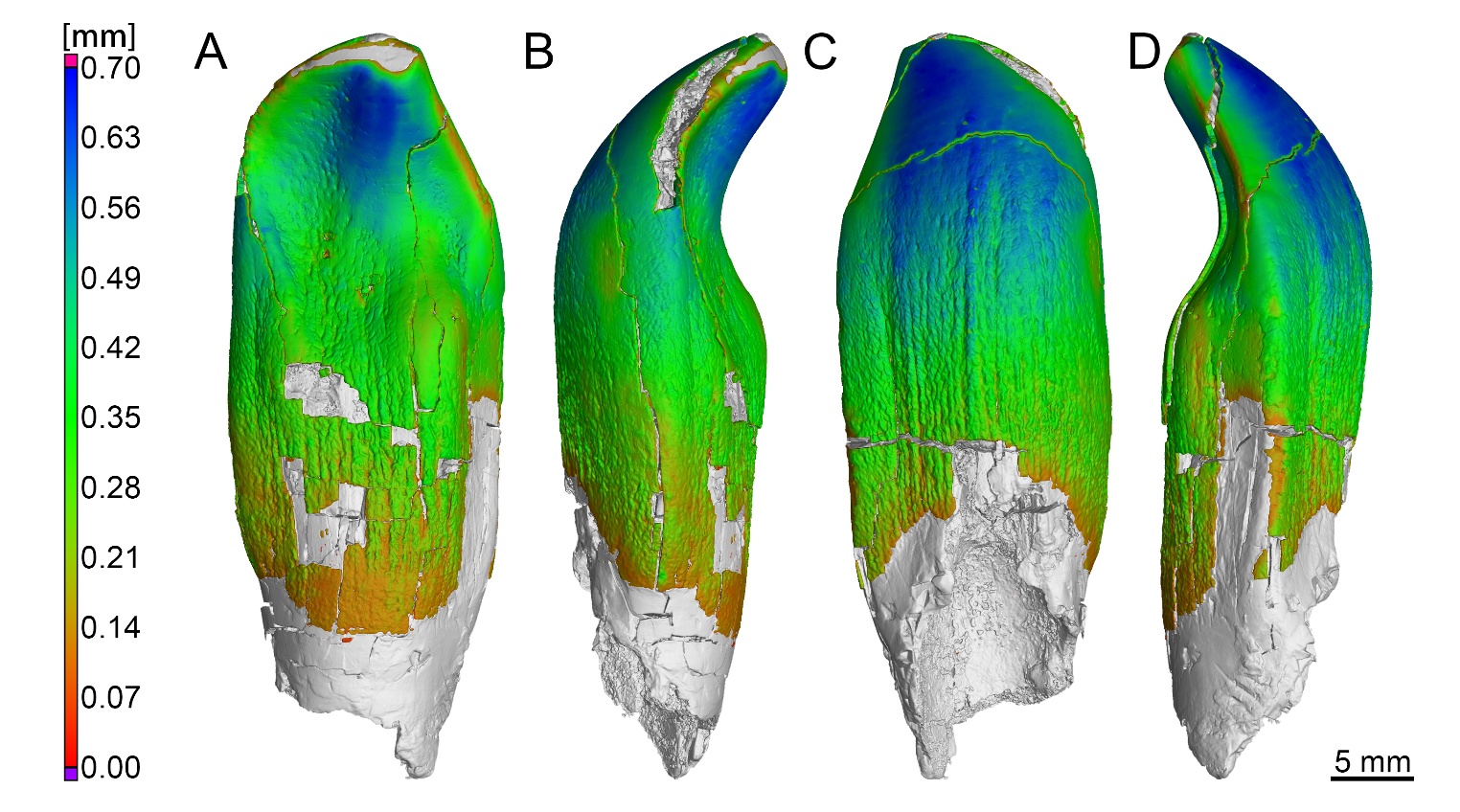 图1马门溪龙类牙齿(PMOL-ADt0009)牙釉质壁厚分析图,A.舌侧视;B.近中视;C.唇侧视;D.远中视。
